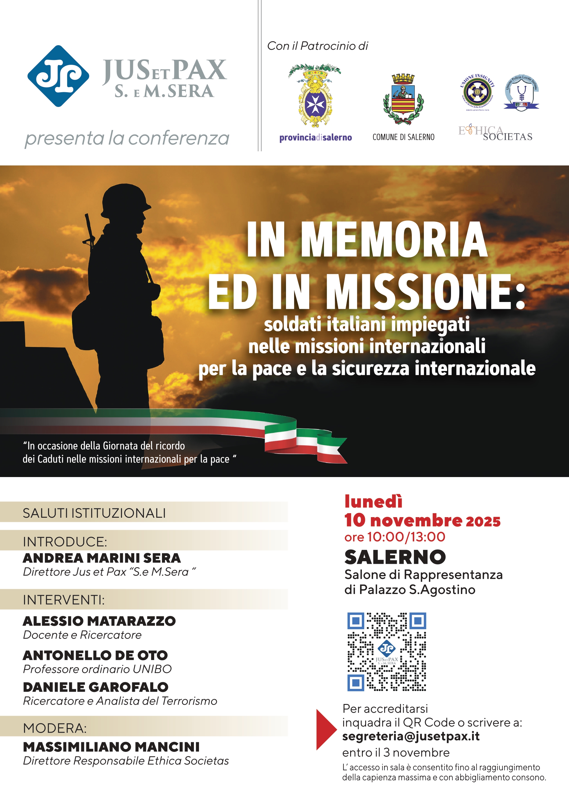 L'evento rientra nell’ambito della Giornata del ricordo dei Caduti civili e militari nelle missioni internazionali per la pace, ed è promosso dall’Ente di Formazione, Ricerca e Studi sulla Pace Jus et Pax “S. e M. Sera”, con il patrocinio del Comune di Salerno, della Provincia di Salerno, dell’Unione Insigniti al Merito della Repubblica Italiana, dell’Unione Polizie Locali Italiane e della rivista giuridica “Ethica Societas”.