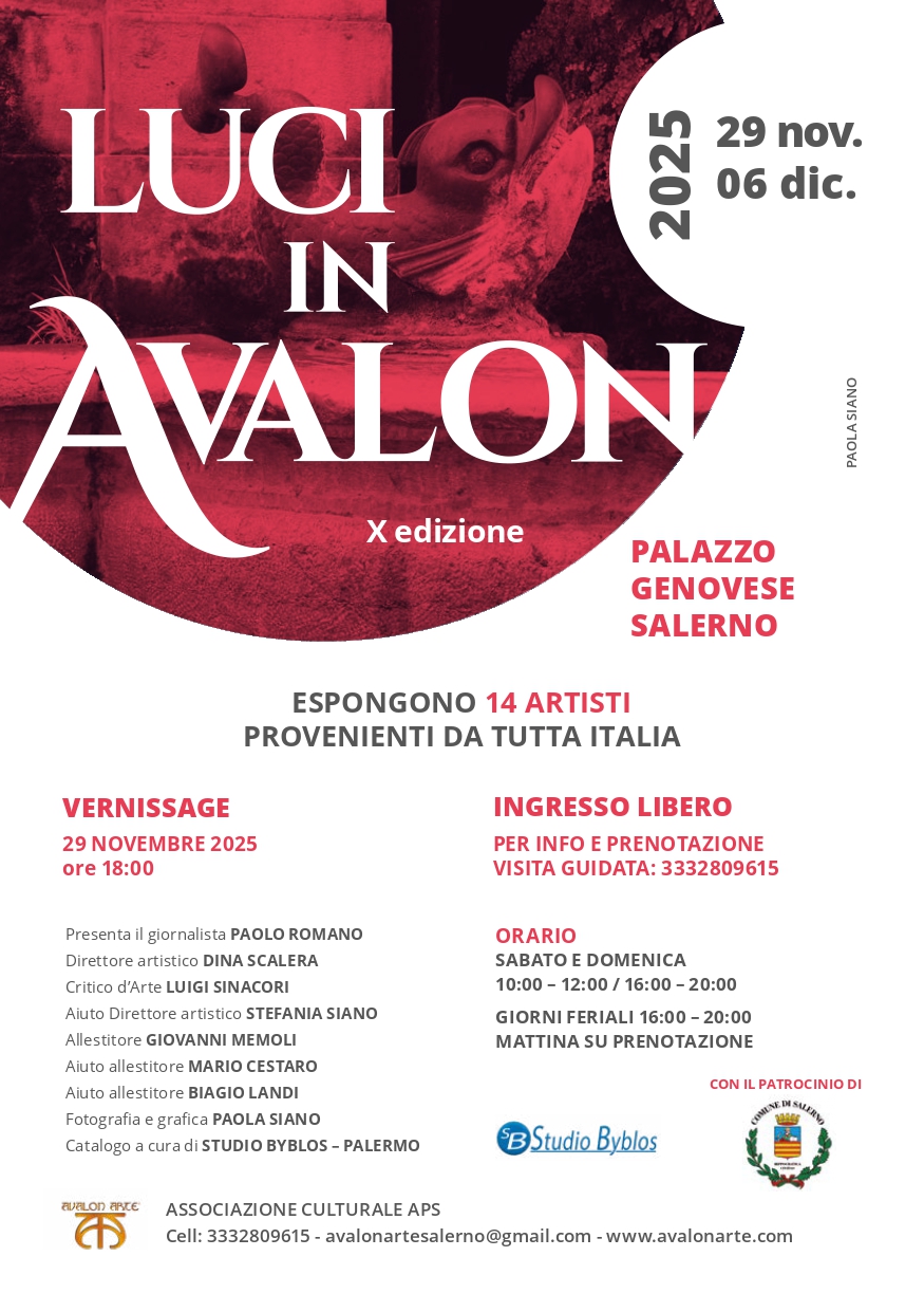 A Salerno il 29 novembre alle ore 18,00 inaugura l’Expo d’Arte Contemporanea “Luci in Avalon”, X edizione nella splendida cornice del prestigioso Palazzo Genovese, sito in Largo Campo, nel cuore del centro storico di Salerno.