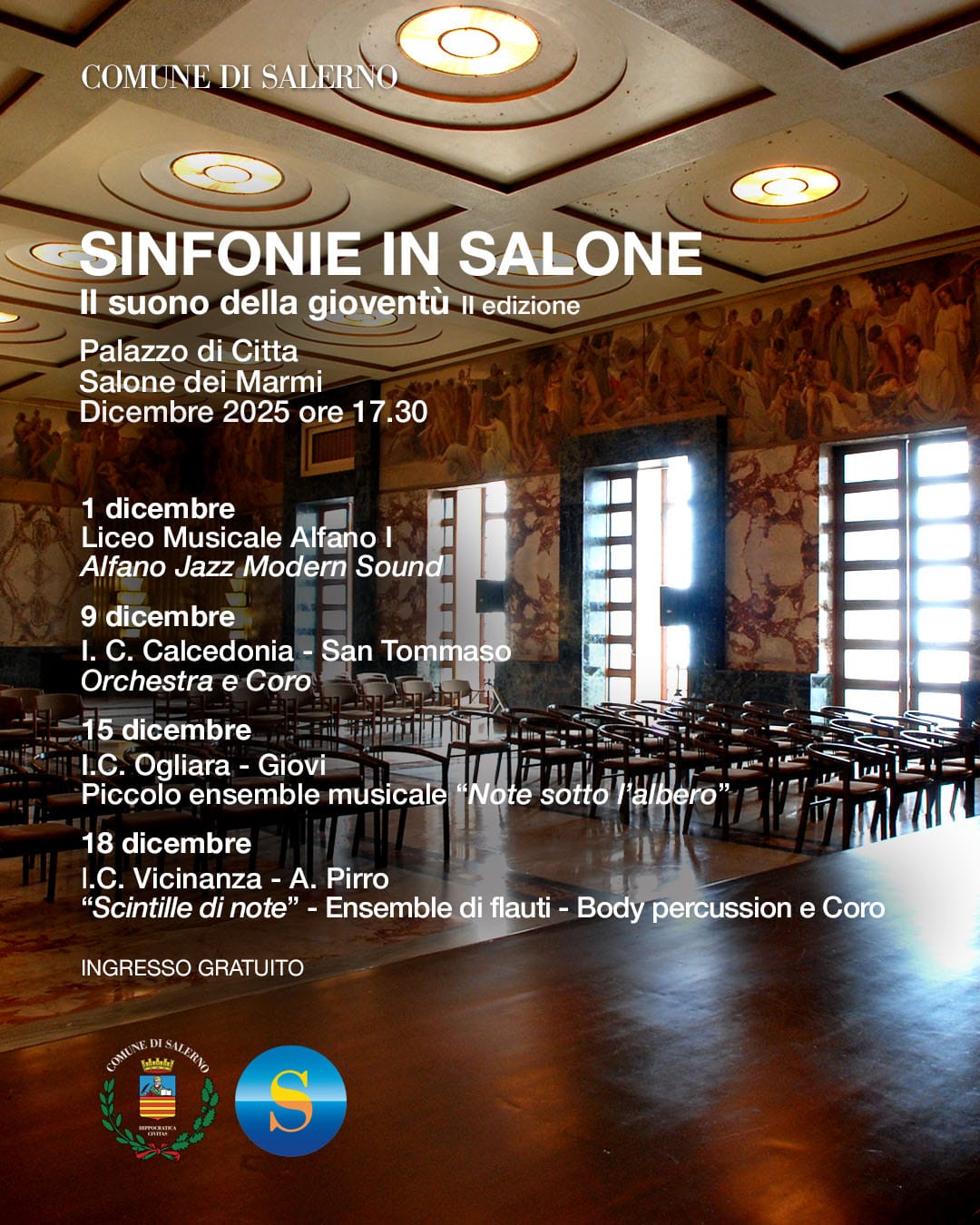 • 27 aprile – IC Tasso: concerto conclusivo della rassegna, un momento di festa e celebrazione del talento giovanile. Con dodici appuntamenti tra dicembre e aprile, “Sinfonie in Salone” diventa un vero e proprio percorso culturale: un ponte tra giovani, scuola e città, capace di trasformare il Salone dei Marmi in un luogo vivo, aperto e inclusivo.
