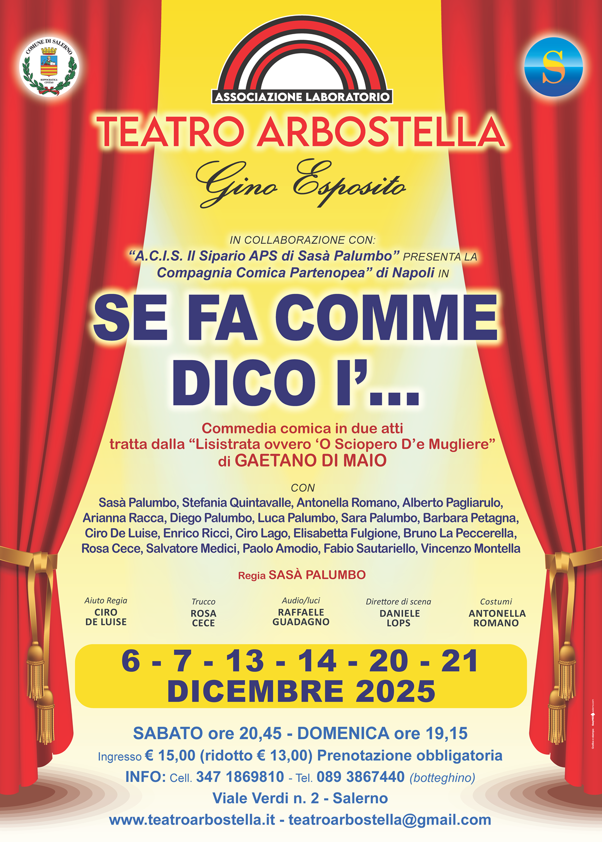 Protagonista dei primi tre weekend di dicembre sarà il noto attore, autore e regista Sasà Palumbo, con la sua compagnia Acis il Sipario, che porterà in scena la brillante commedia "Se fa comme dico i…", adattamento moderno e comico della celebre Lisistrata di Aristofane, rielaborata su testo di Gaetano Di Maio.